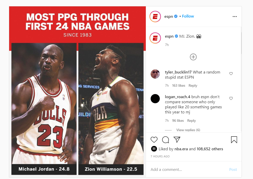 One of the latest things they did was comparing Williamson to none other than the GOAT, Michael Jordan. They shared a graphic showing the most points per game through the first 24 NBA games. First, it was His Airness with 24.8 PPG, followed very closely by Williamson with 22.5 points per outing. This picture didn’t please anybody and fans were quick to call out ESPN for their post, asking them to stop comparing Zion with MJ.