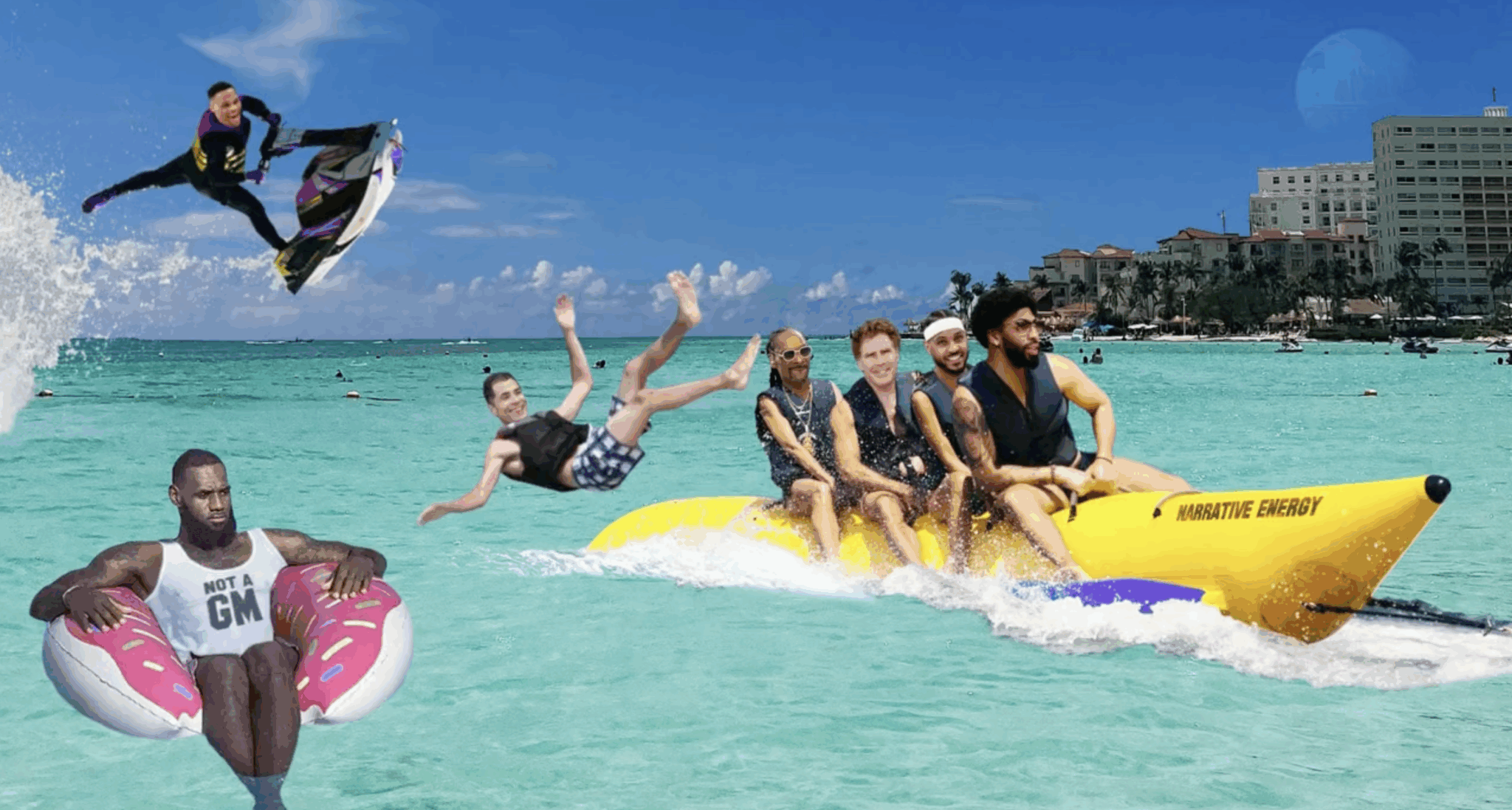 During a Thursday broadcast, the NBA on TNT crew mocked the Los Angeles Lakers for getting eliminated from the NBA playoffs with a lot of jokes, including the oft-mentioned Cancun reference. In a photoshopped picture, LeBron James (wearing a ‘Not A GM’ T-Shirt) sits on a floatie, Russell Westbrook rides a jet ski, and Anthony Davis, Carmelo Anthony, Snoop Dogg, Will Ferrell, and Rob Pelinka ride a banana boat.