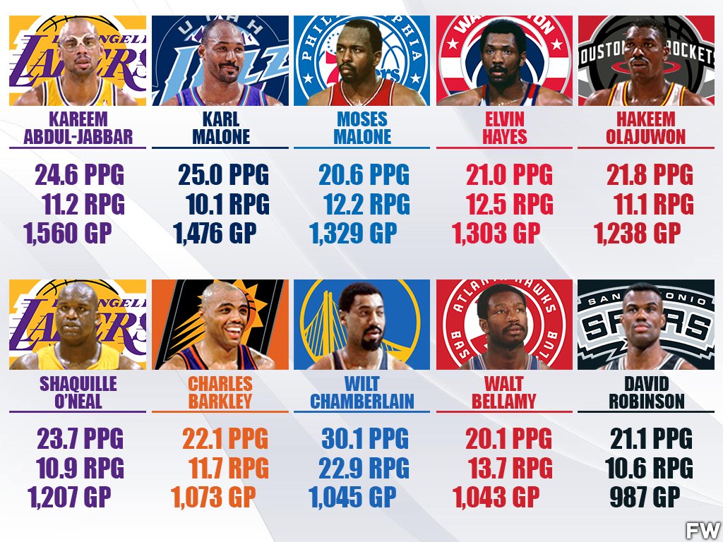 Out of everyone’s career resume on this list, Kareem Abdul-Jabbar’s is certainly the most impressive. He is the all-time leader in points in NBA history. His 1,560 games are a testament to his consistent elite level of production. For 12 straight seasons to begin his career, Jabbar hit the target mark of 20.0 PPG and 10.0 RPG. He remained a 20.0 PPG scorer until his career had nearly come to a close, but his rebounding numbers dipped a bit due to injuries and the arrivals of Kurt Rambis and Mychal Thompson.