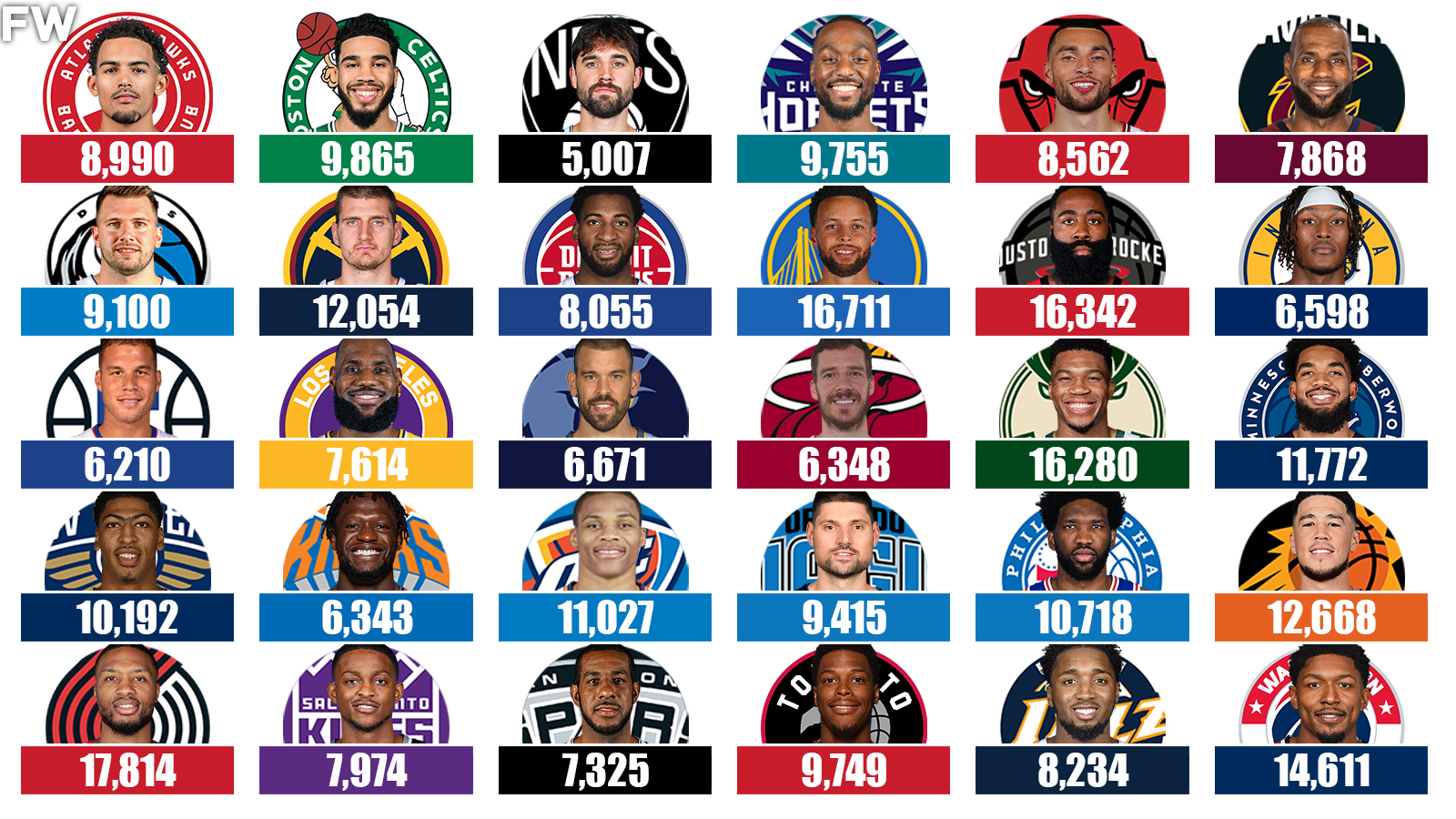Recently, we discussed the NBA players with the most combined points, rebounds, and assists over the last 10 seasons. Today, we are going to do things a little differently. The list below will consist of all 30 NBA teams and their leading scorers over the last decade. Included here, you will see scoring champions, MVPs of the league, and many NBA champions and Finals MVPs as well. Of course, we are just calculating regular season points scored for the list below.
