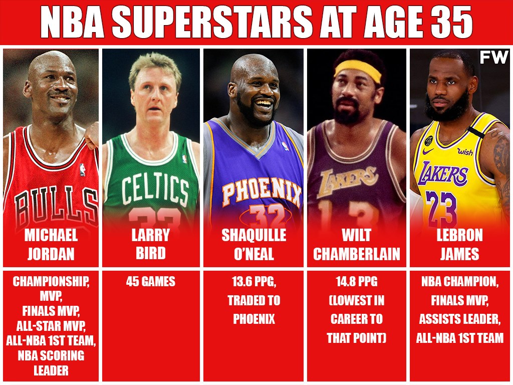 NBA Superstars At Age 35: Michael Jordan Champion, LeBron James NBA Finals, Larry Bird 45 Games, Shaq O’Neal 13.6 PPG, Wilt Chamberlain 14.8 PPG
