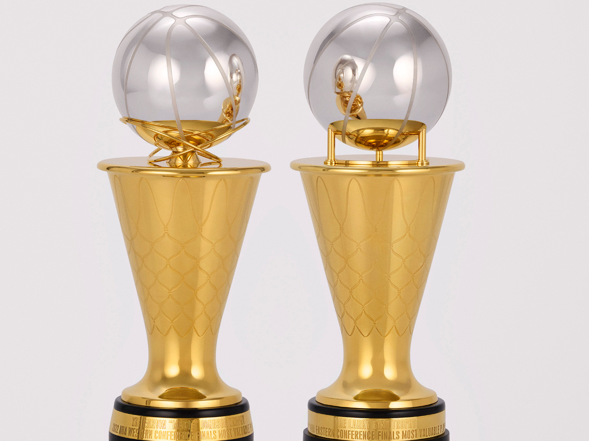 Each Conference Finals MVP trophy raises a sterling silver ball, similar to the conference champion trophies. The trophy bears a 24k gold vermeil net in its support structure, mirroring the new Finals MVP trophy, and stands 14 inches tall and weighs approximately five pounds.