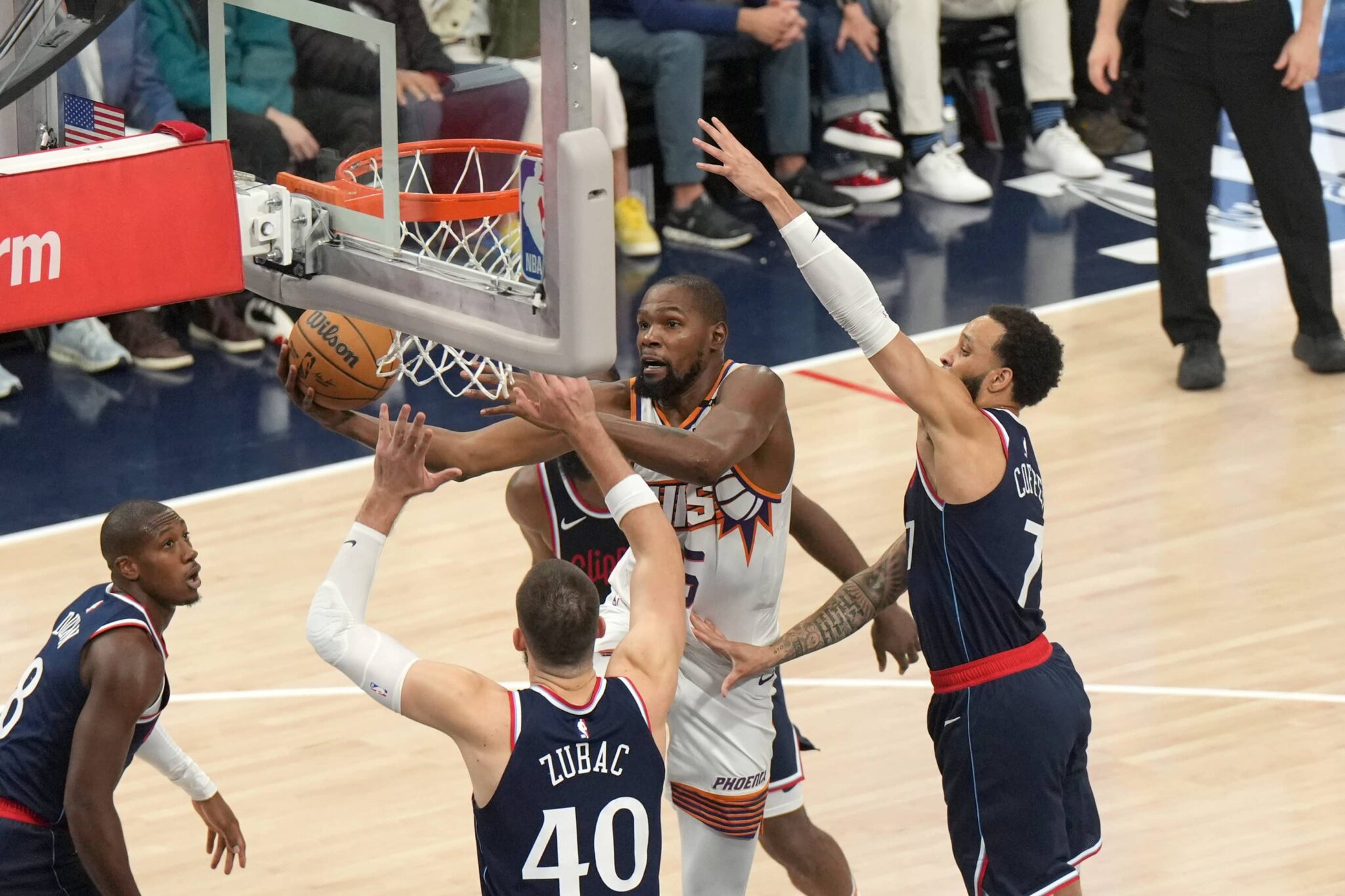 The Phoenix Suns managed to squeak by the Kawhi Leonard-less Los Angeles Clippers last night in overtime 116-113, despite 29 points and 12 assists from James Harden. Kevin Durant (25 points) and Bradley Beal (24 points) led the way, coming up with big baskets throughout the game to sneak by with a victory in a game they probably should have lost (trailing 99-90 before scoring 11 straight points to go on top).