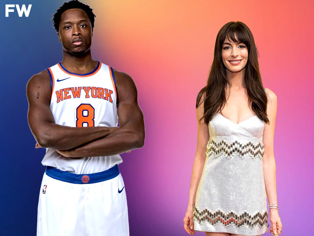 Academy Award winner Anne Hathaway was sitting courtside and saw Knicks forward OG Anunoby almost crash into her seat during the game as she attended the game with her four-year-old son.