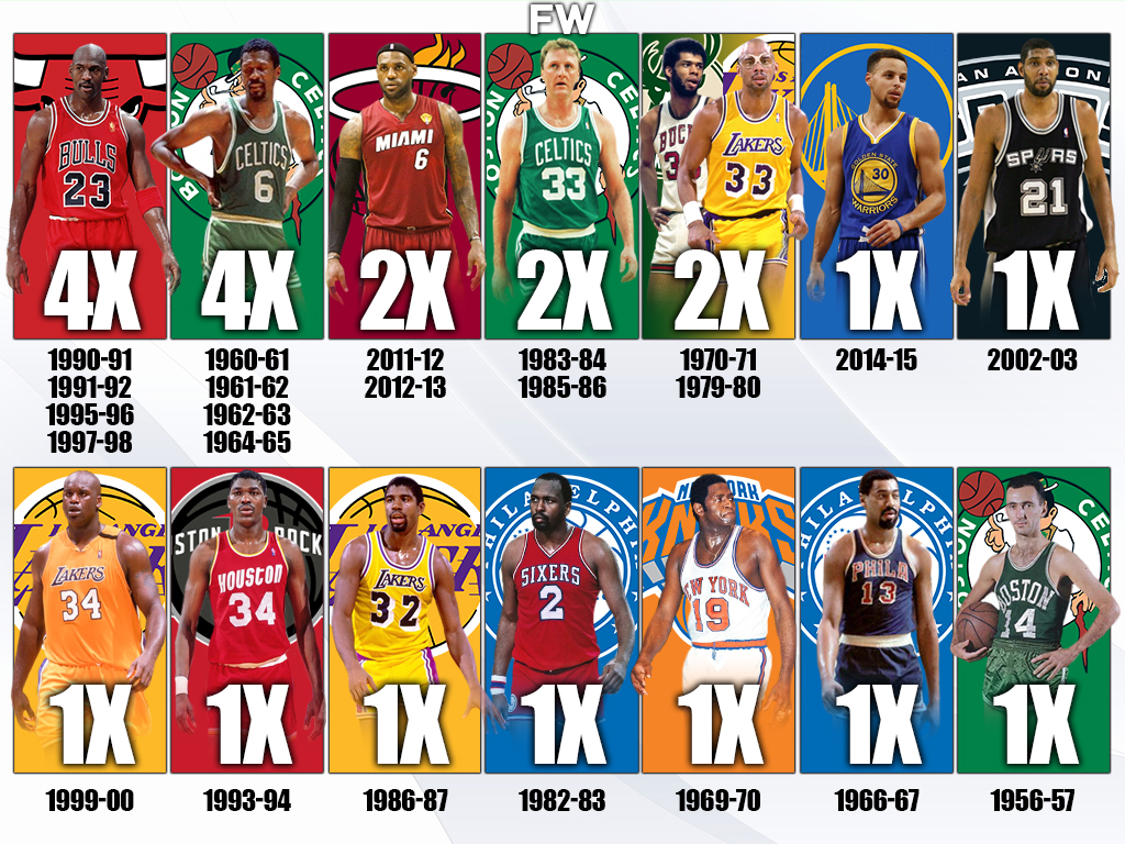 Whenever the greatest winners in basketball history are brought up, Bill Russell is the name that has to be mentioned. Russell is only one of two players to have captured the MVP and championship at least four times and is also the player with the most number of championships as an individual player. Russell had a total of 11 rings, so it is not shocking that some of those seasons came with an MVP award attached.