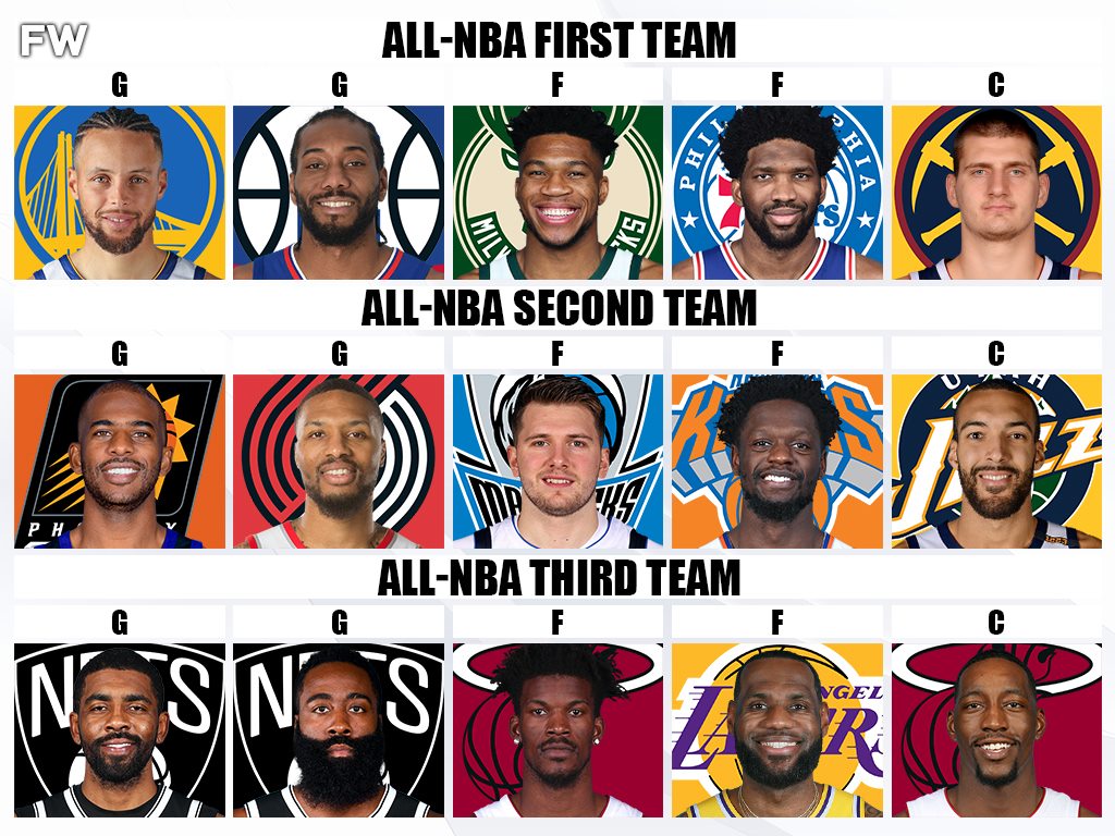 First Team: Steph Curry, Damian Lillard, Kawhi Leonard, Giannis Antetokounmpo, Nikola Jokic