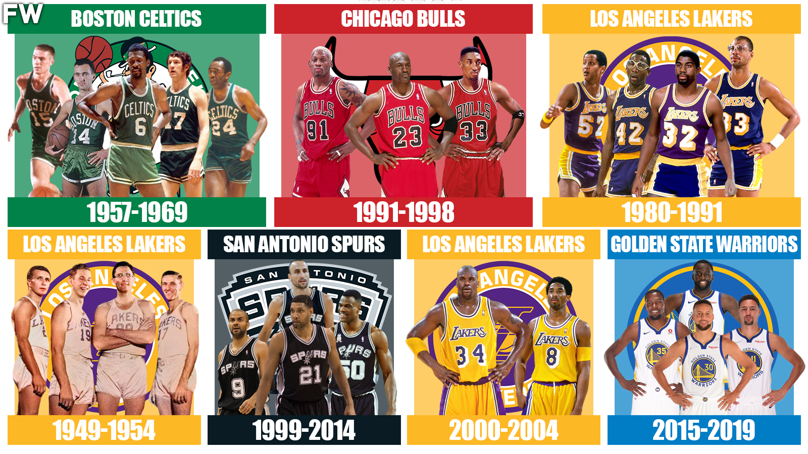 The most recent inclusion into the dynasty list is the Golden State Warriors. The Warriors won three NBA championships during this span (2015, 2017, and 2018). Winning multiple championships in a short period is a hallmark of a dynasty, and the Warriors’ ability to secure three titles in five years solidified their status as one of the most dominant teams in NBA history.