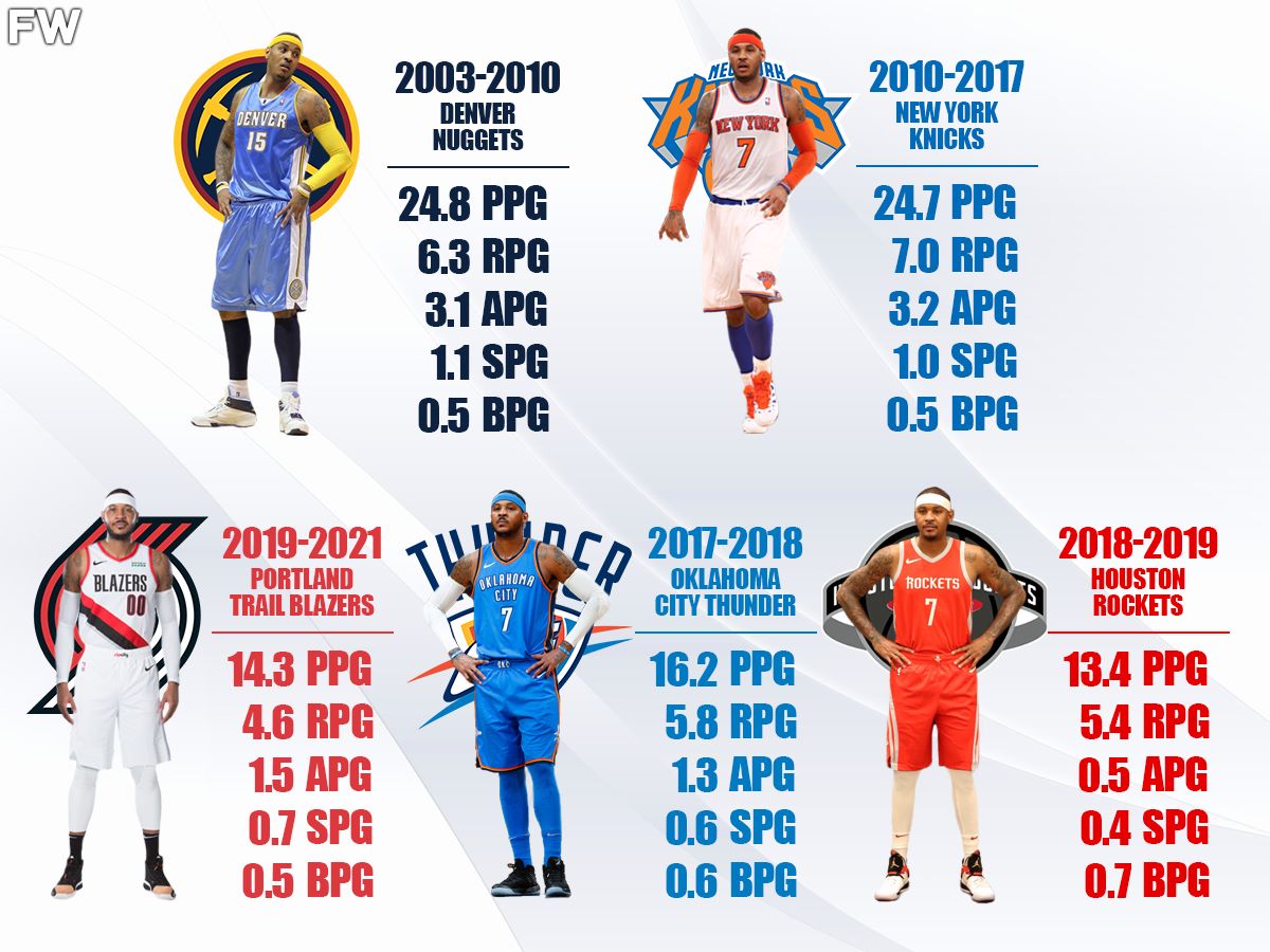 In the 2021-2022 season, Anthony will suit up for the Los Angeles Lakers and will most likely end his career with them. But looking back at Anthony’s career so far, where did he play best? Anthony went through different challenges at each stage of his career, and his game has been tweaked over the years. But it is time to rank the best version of Carmelo Anthony based on his impact with the 5 different franchises he played for.