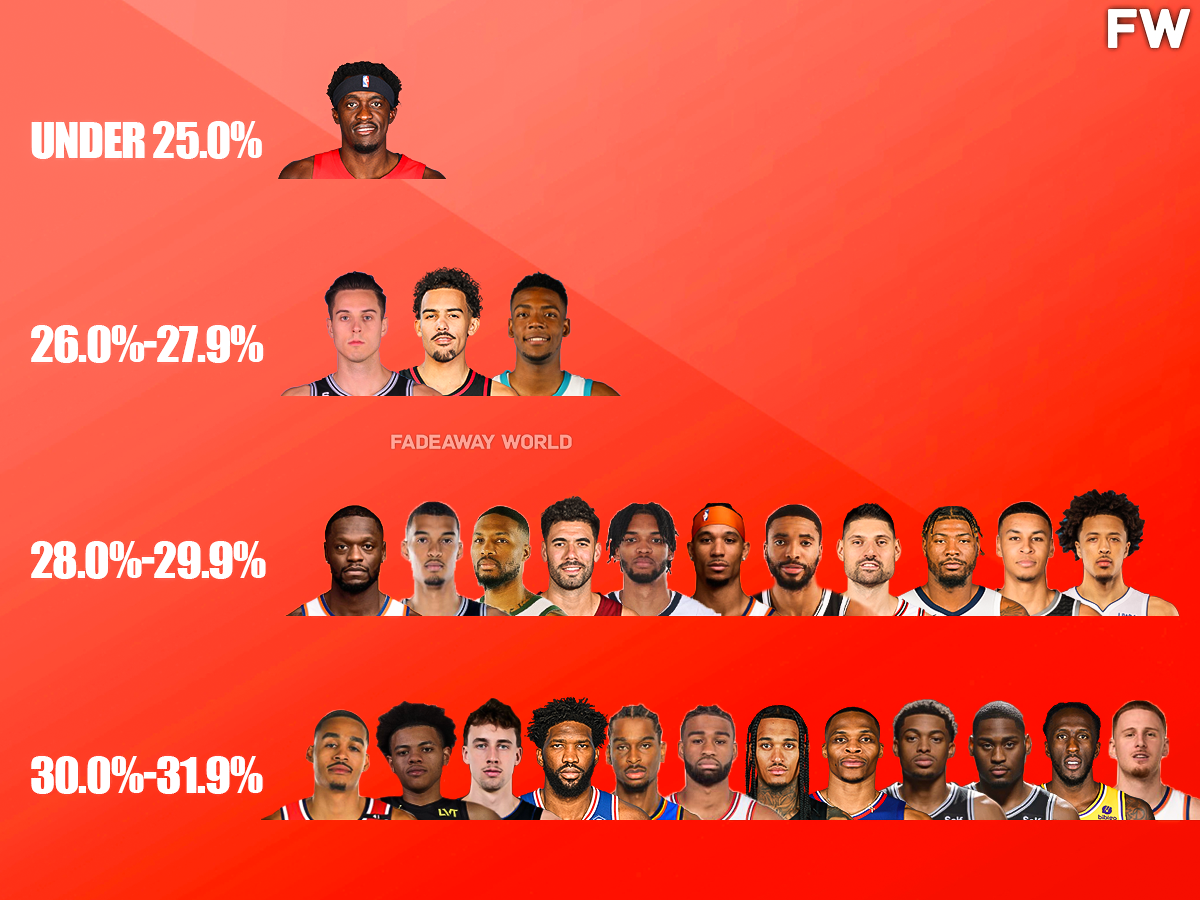 The next tier of players who are having even worse starts to the season consists of 12 players shooting between 28.0% and 29.9% from three. Much has been said about Julius Randle’s struggles to start the season for the Knicks, particularly his shooting numbers. Randle is currently shooting just 35.9% from the field overall and 28.2% from three which is the fifth-worst percentage in the NBA.