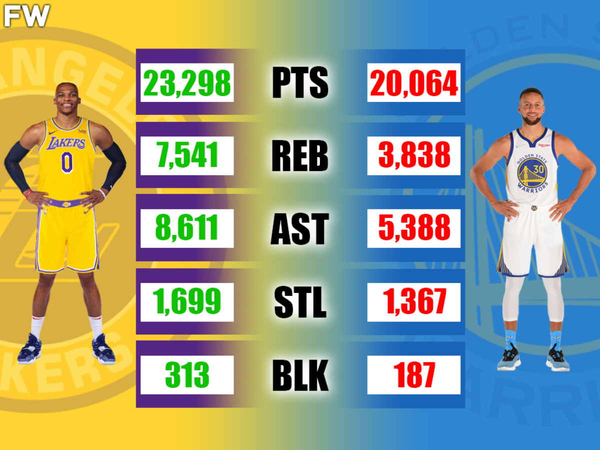 The fan is technically correct. Westbrook has over 3,000 points more than Curry overall, 23,298 to Curry’s 20,064. The rebound margin is even higher, with Westbrook almost doubling up Curry’s 3,838 with 7,541 career boards. The assist total also has a discrepancy of over 3,000, Westbrook has 8,611, and Curry has just 5,388. The steals are quite close in number, just 1,699 to 1,367, while Westbrook has 313 blocks to Curry’s 187.