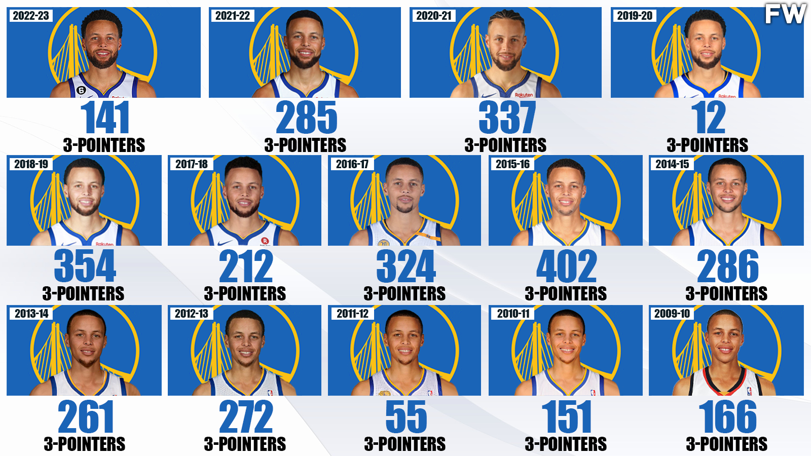 With the Stephen Curry-lead Warriors changing the game in recent years, the three-point shot is the new norm in the NBA. The point guard has become the most renowned player in the world because his ability to let shots loose from the perimeter places him by himself as the greatest to have ever lived. Not to mention, Curry is continuing to climb the scoring charts as he is now the 41st greatest scorer ever after passing Pau Gasol in the rankings. Stephen Curry is regarded as the best 3-point shooter ever, but how many threes has he made in every season of his career? Curry’s resume as a shooter is second to none, and here is the ultimate three-point list of the NBA’s greatest shooter per season since his rookie year.