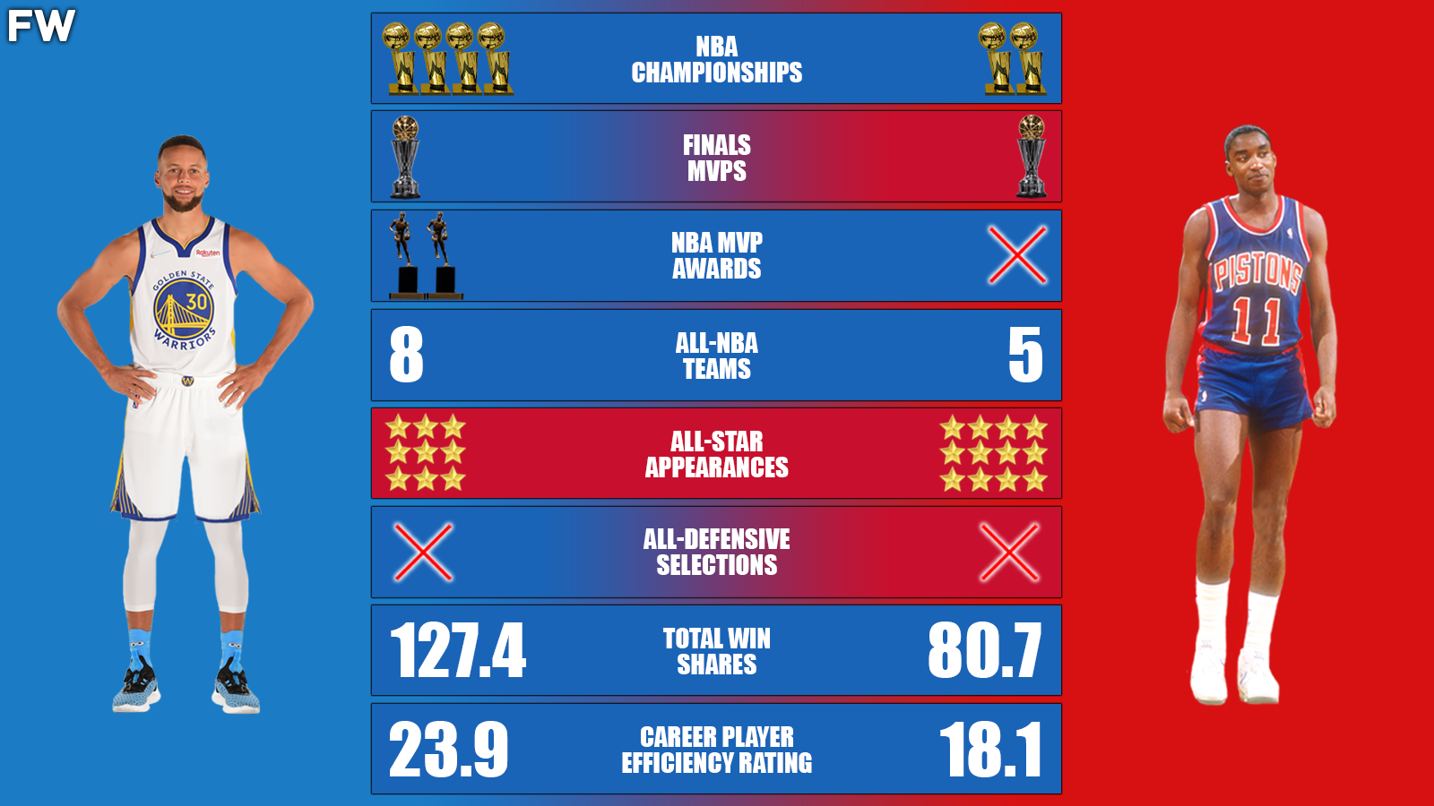 Stephen Curry and Isiah Thomas are often considered the second-greatest point guards of all time. This is the career comparison between these two legends.