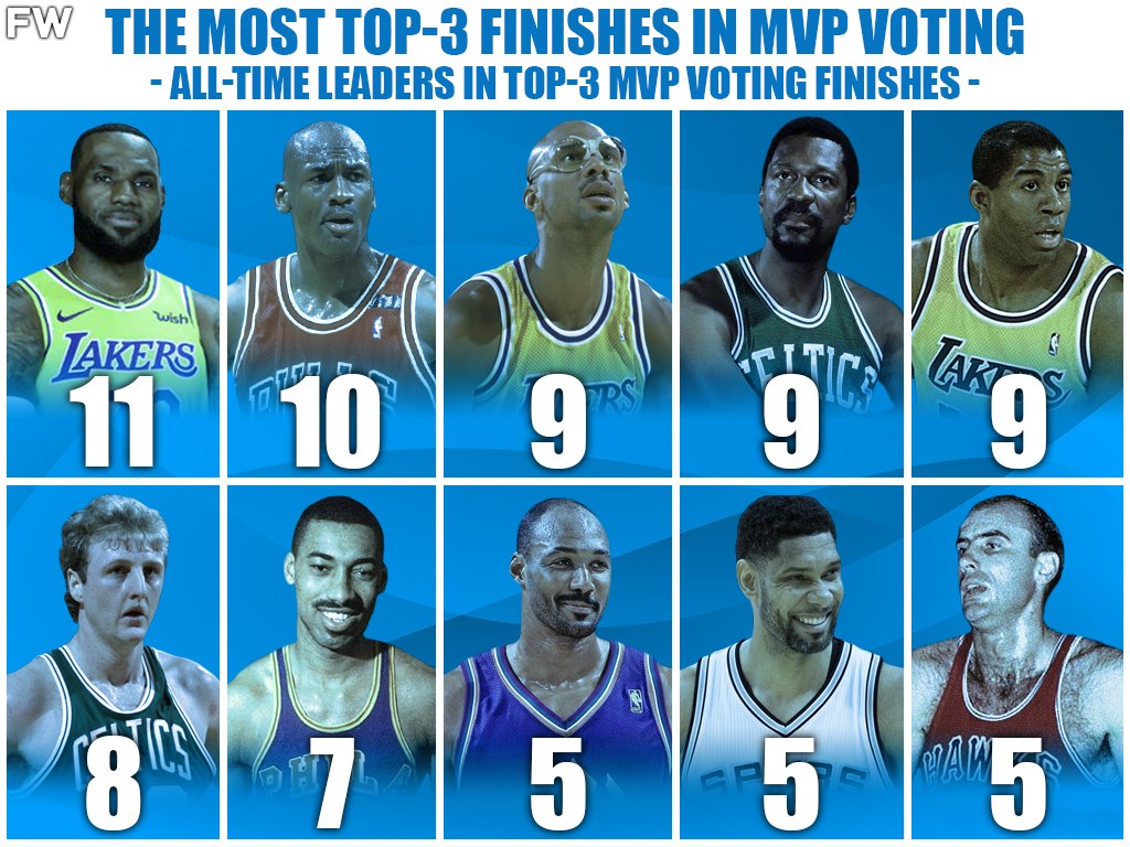 Finishing near the top of the MVP voting is an accomplishment in itself, but fans often forget those who finished second or third in most seasons. It can be hard for truly great players to win the award several times since people come to always expect high-level production from them, so to give these legends their proper respect, here are the top-10 players with the most top-3 finishes in MVP voting.