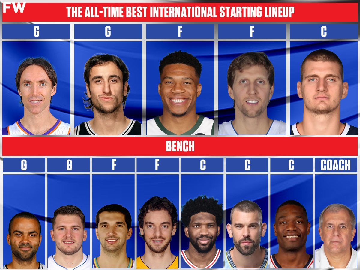 Using nothing but a pool of international players, we have created what we think could be one of the most unstoppable lineups ever. Offensively, this team is a juggernaut that can attack and dominate you from all angles. Nash and Ginobili make up a well-rounded playmaking backcourt that will be the perfect duo to set up the rest of the team for maximum success. Doncic and Tony Parker also do this from the bench. Giannis and Jokic will dominate the paint while looking to facilitate when it gets clogged. Dirk will be our primary shooter to start while Stojakovic and Doncic help out with that from the bench. All in all, the interior and perimeter offense for our international team will prove to be far too much for opponents.