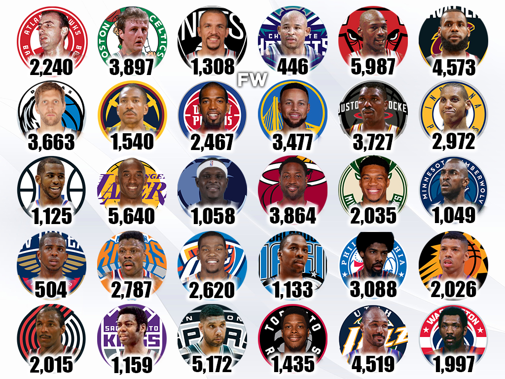 Here are the players with the most total points scored per franchise history, where we might get a very interesting perspective on the careers of some of the greatest players ever. It is important to realize that players who stayed with one franchise for their entire careers have the edge over other stars who moved teams over their careers.