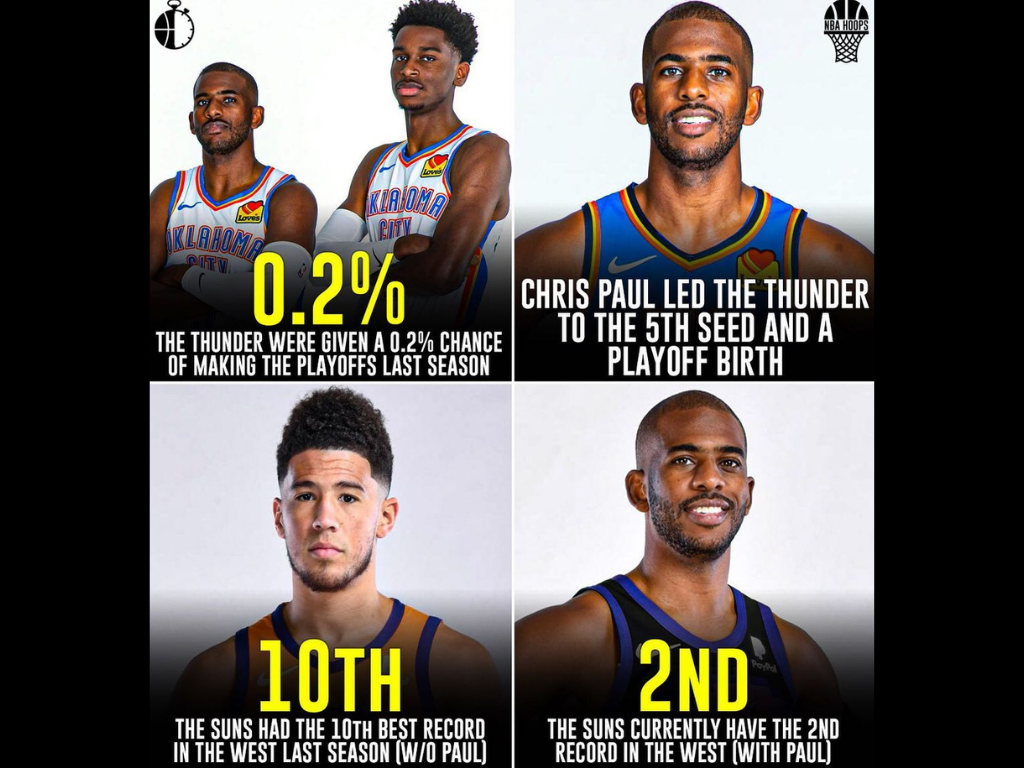 CP3 has revitalized every team where he played and the last two seasons are the biggest example of that. He landed in OKC after failing to win a championship with James Harden and the Houston Rockets; he was given 0.2% chances of making the playoffs and they did it against all odds, taking the Rockets to a 7th game in the first round of the 2020 NBA postseason.