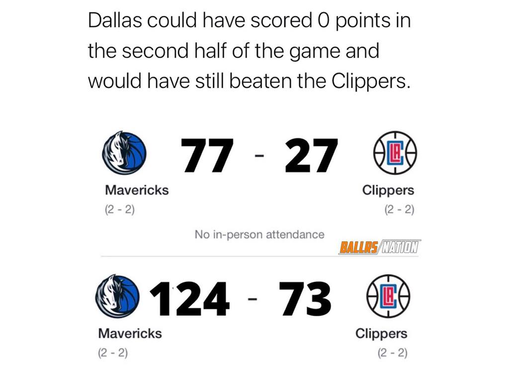 The first half of the game ended 77-27 for the Mavericks. The final outcome of the game was 124-73, 51 points of difference. Had the Mavs not scored a single point in the 3rd and 4th quarter, the game would have ended 77-73 for the Clippers, which only makes this incredibly awful.