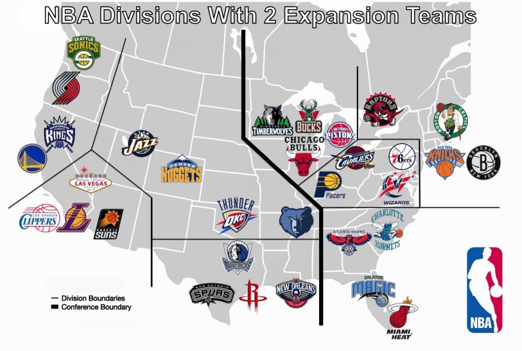 Here's one idea online for a 32-team NBA with Seattle and Las Vegas in the West and Minnesota in the East. Eight divisions in two 16-team conferences. Thoughts?