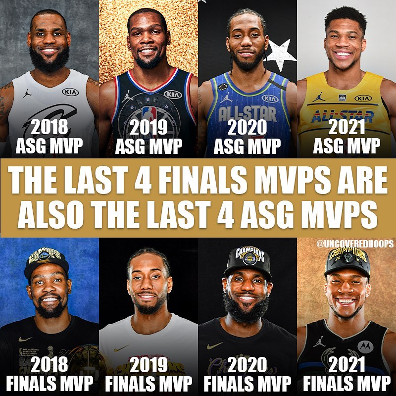 NBA Uncovered shared this interesting fact on Instagram, recalling that Kevin Durant, Kawhi Leonard, LeBron James and Giannis Antetokounmpo won the ASG and Finals MVP in the last four years.