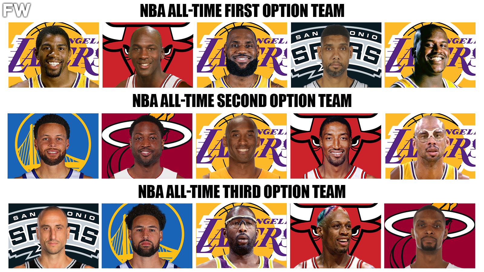 We have seen dominant third options on most superteams throughout history, and these guys are also required to be scoring threats and do a little more of the dirty work than second options. The third options that won multiple championships often go underappreciated due to them sacrificing their personal stats, but in doing so, they have managed to achieve incredible success. Basketball is a team game, and every player is important, but here are the all-time starting fives of the First Option, Second Option, and Third Option teams. It is amazing to see how dominant these players were during their times, and it yields very interesting lineups.