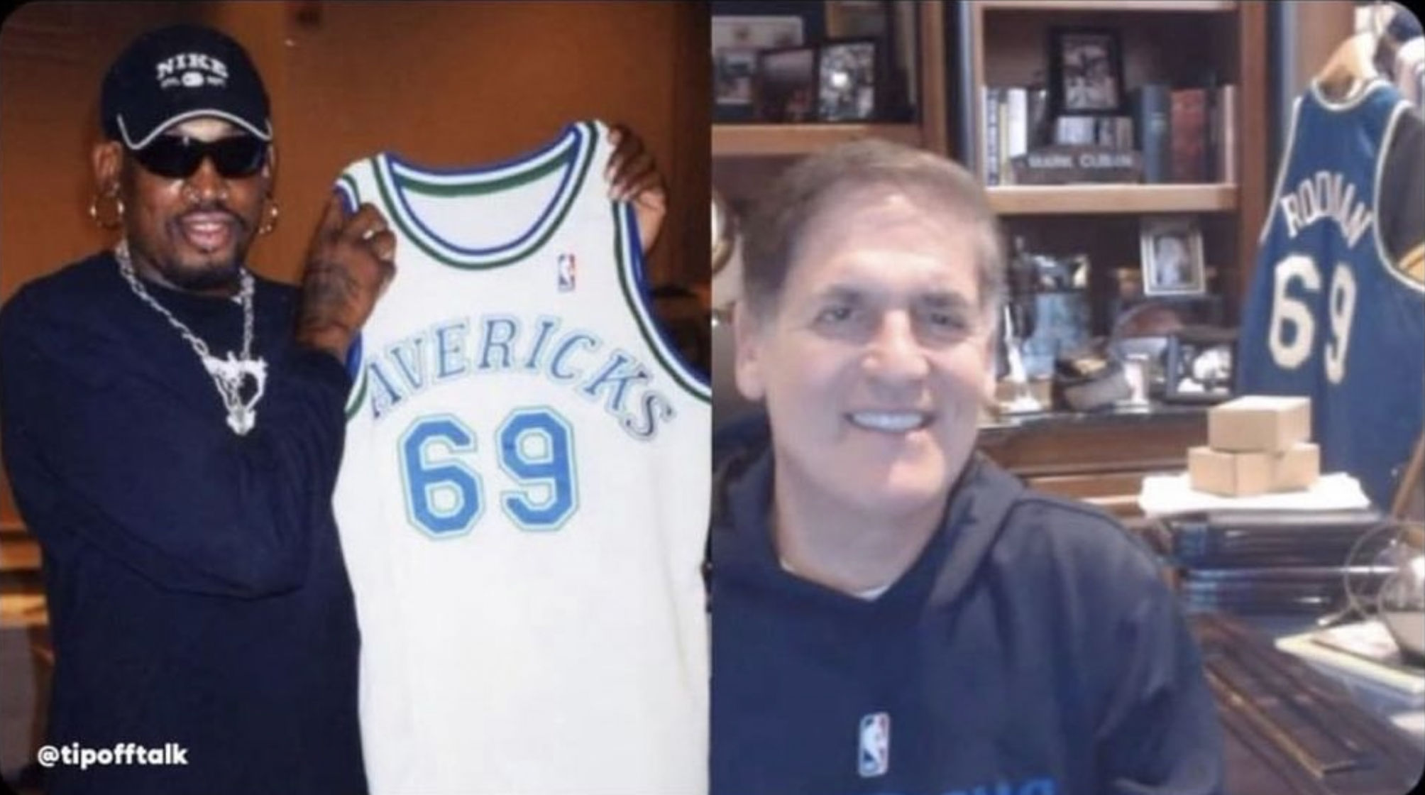 But the jersey still ended up getting made, as Rodman even took a picture with it. And in fact, a picture of Mark Cuban in his office even shows that the jersey is hanging in the background.
