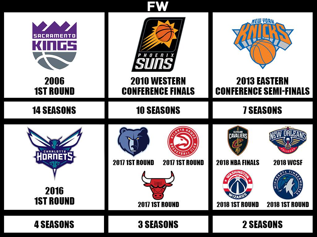 The Washington Wizards made the NBA playoffs in 2018, making it a 2-season drought. The Wizards had John Wall and Bradley Beal, a consistent duo that made the Wizards a consistent playoff team. But they fell in the first round to the Toronto Raptors in 6 games, thanks to a strong series by DeMar DeRozan.
