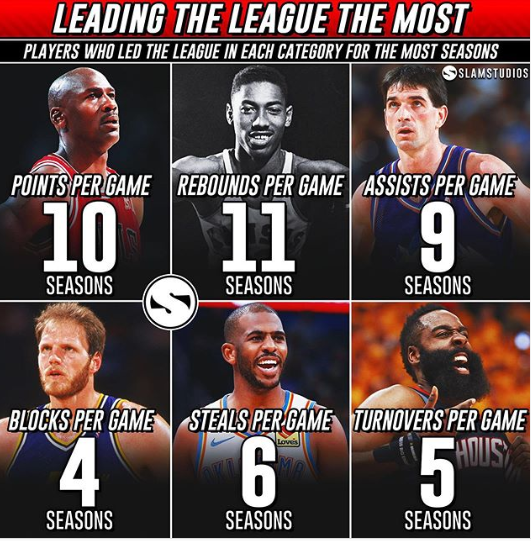 Throughout the course of history, however, some players have stayed at the summit of a stat throughout the most of their careers. That’s why today, we’re going to honor them by talking about the players who have led the league in each category the most times: