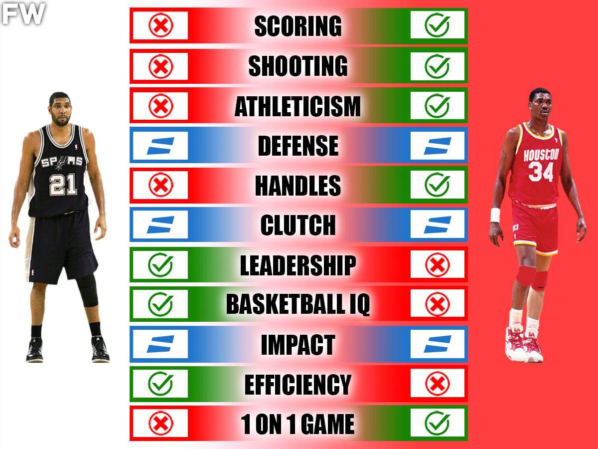 Ultimately, the 5-3 result reflects the fact that both Hakeem Olajuwon and Tim Duncan were exceptional players who made their mark in different ways, but the Houston Rockets star might have been the better individual player who won two titles without having Gregg Popovich, Tony Parker, Manu Ginobili, and David Robinson.