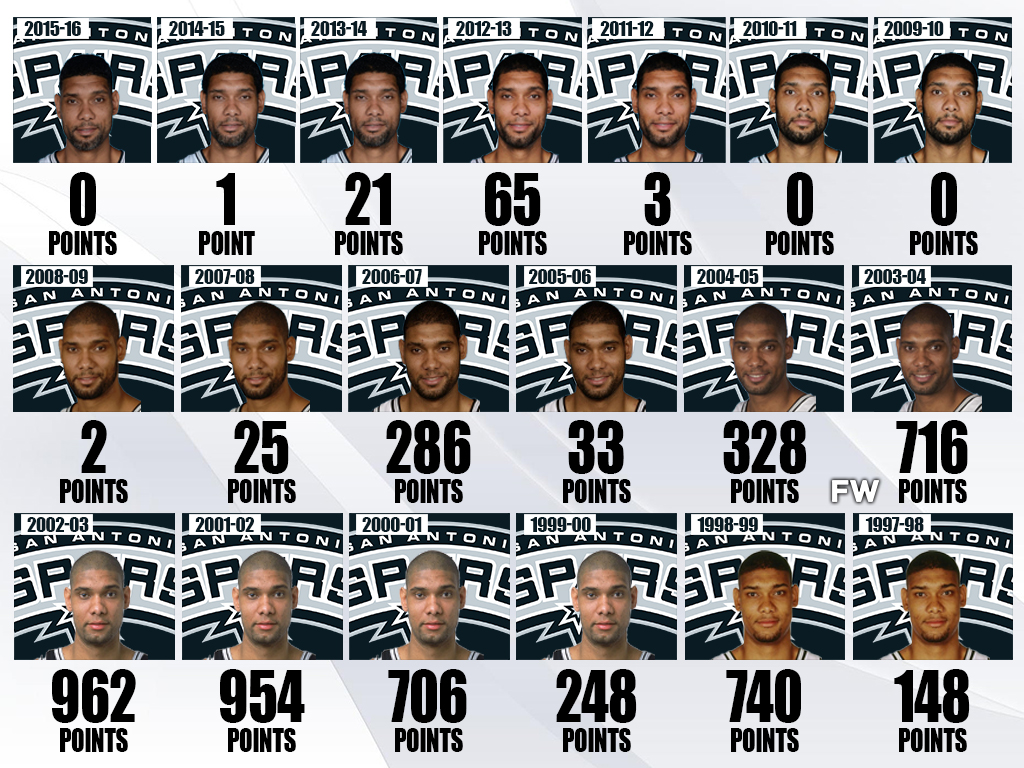 At age 37, Tim Duncan was slowly declining in terms of numbers and was no longer the most dominant offensive player on the team. The big man still defended the rim well, could score on the block, and rebounded well enough to almost make the All-Star Team. Because of his leadership and team record (62-20), Duncan earned 21 MVP votes, although he never had a chance of winning the award. Duncan had the last laugh anyways as he won his 5th NBA championship.