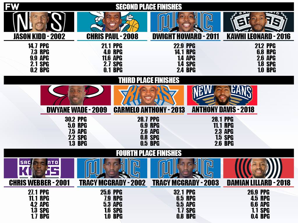 McGrady finished fourth consecutive seasons while playing for the Orlando Magic as a youngster. In 2002, he lost to winner Tim Duncan, Jason Kidd, and Shaq in that order. The following year, McGrady led the league in scoring but finished behind Duncan (repeat winner), Kevin Garnett, and Kobe Bryant. McGrady’s biggest proponent against him in 2003 was that the Magic were just 42-40 on the season.