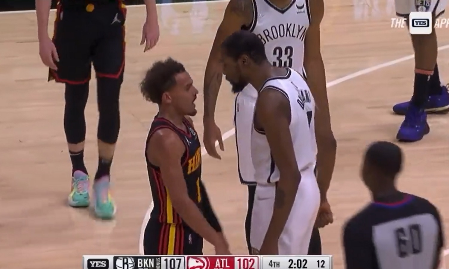 During the last two minutes of the game, KD and Trae got into it and exchanged a couple of words. It’s worth noting that Trae is 6’1″ and KD 6’11”, but that wasn’t a big issue for the Atlanta Hawks point guard, who stood up and fired back at Durant.