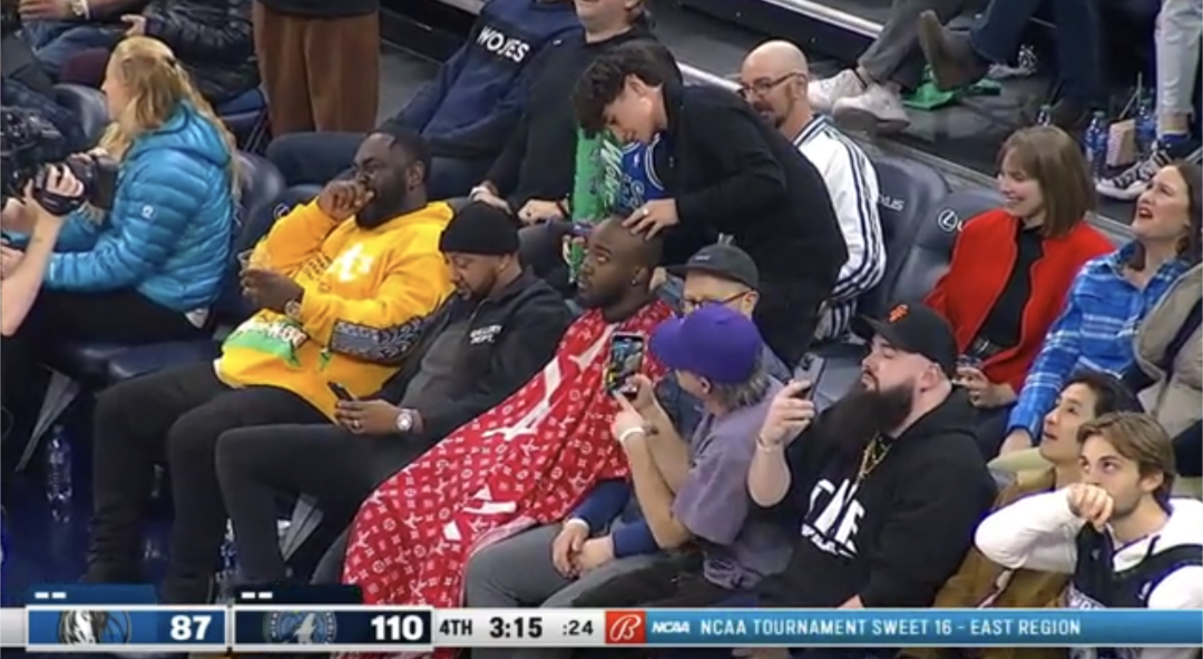 During the recent Dallas Mavericks-Minnesota Timberwolves game a fan was getting a haircut while sitting in the crowd for the game. It is clear from the broadcast that both fellow fans and players that were present found the fan really funny.