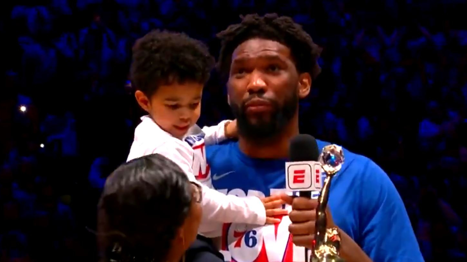 Joel Embiid called his son Arthur to join him during his MVP acceptance speech and got visibly emotional as he held him in his arms.