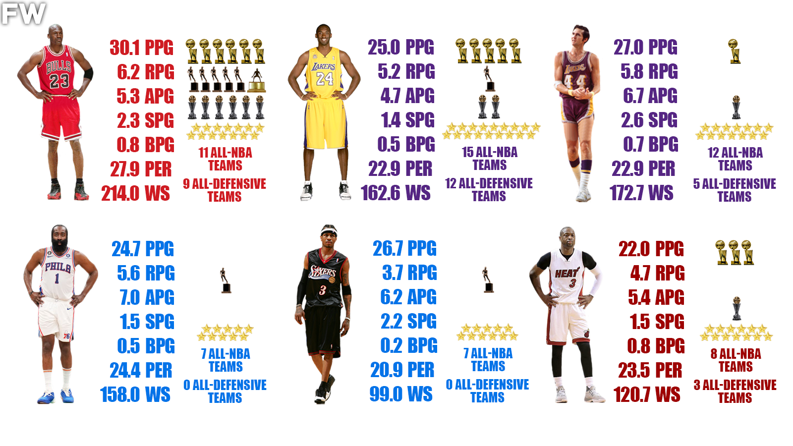 As for Harden and Iverson, this by no means makes them bad basketball players. Remember, we are trying to come up with the GOAT of the position and that means that some players do not belong in the conversation. Harden and Iverson are those two players when it comes to shooting guards. Can they be considered top-five and top-six at the position? Absolutely, nobody is saying they can’t. However, the top-three territory is reserved for the best and Michael Jordan, Kobe Bryant, and Jerry West are those three players by a considerable margin.